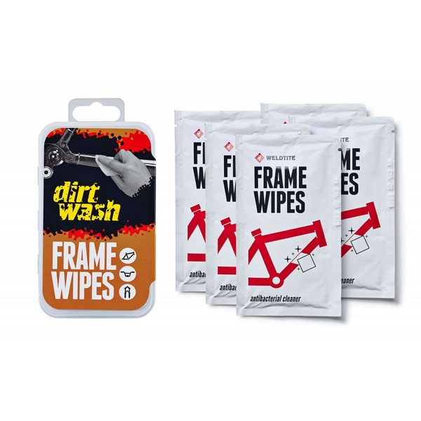 Un paquete de cuatro bolsitas de un solo uso de tamaño práctico para usar sobre la marcha: elimina la suciedad, la grasa y los lubricantes de su marco.