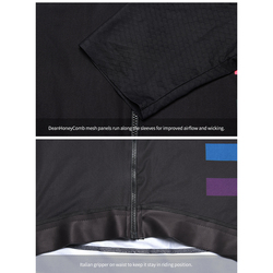 Los paneles de malla DeanHoneyComb corren a lo largo de las mangas para mejorar el flujo de aire y la absorción. Una cremallera YKK de 'semibloqueo' de longitud completa proporciona un flujo de aire adicional y está diseñada para un fácil uso con una sola mano. Pinza italiana en la cintura para mantenerla en posición de conducción.